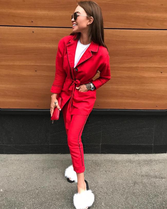 Nearly nothing screams “chic” as loud as basic red taxedo outfit paired with a pair of fluffy slides.