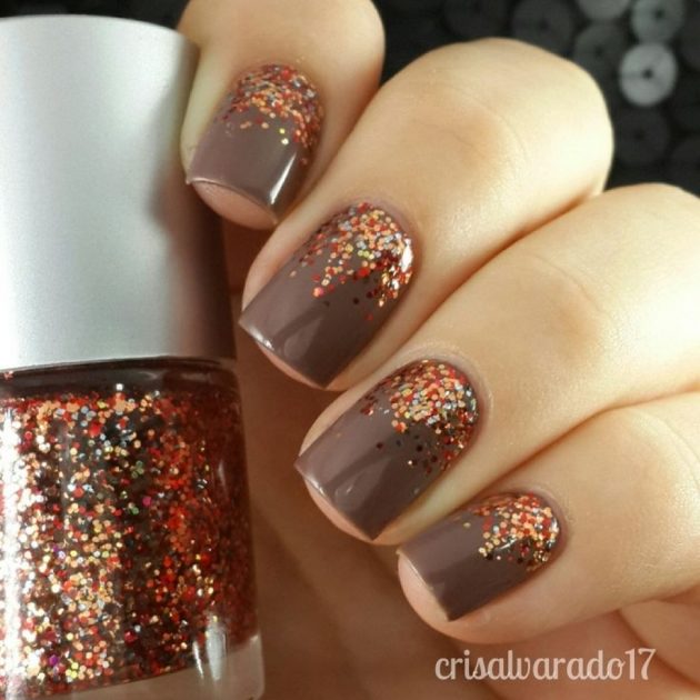 If you decide to draw some pattern on your nails, in this case some leaves, choose contrasting shades, so that the pattern can stand out. So if you choose brown to be the base color, then yellow, orange or gold can be perfect choice for the leaves. Also, you can use black to define the leave design better.