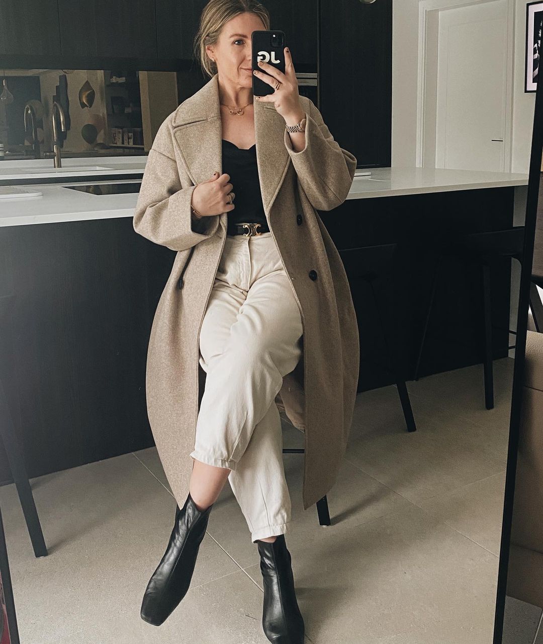 Camel coat + white jeans + ankle boots