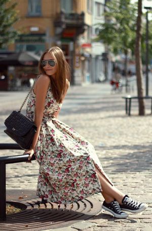 Summer dresses that doesn’t require teetering around in painful heels, but this look is about more than just comfort. A white dress can also be a great backdrop to let your statement accessories shine, especially if you’re wearing a colorful pair of sneakers and a brightly colored handbag.