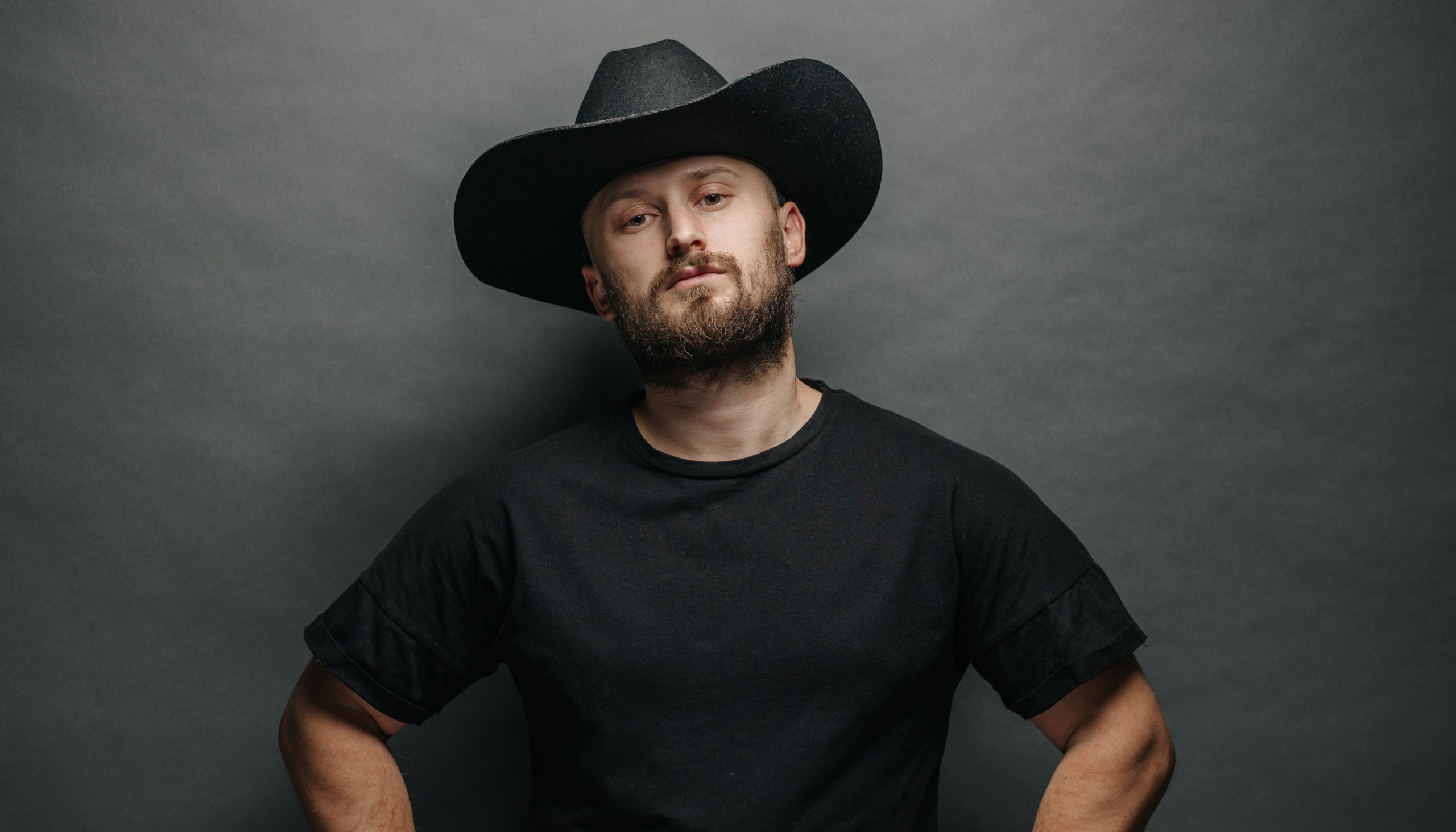 Handsome cowboy wearing black cowboy hat with beard / via Adobe Stock